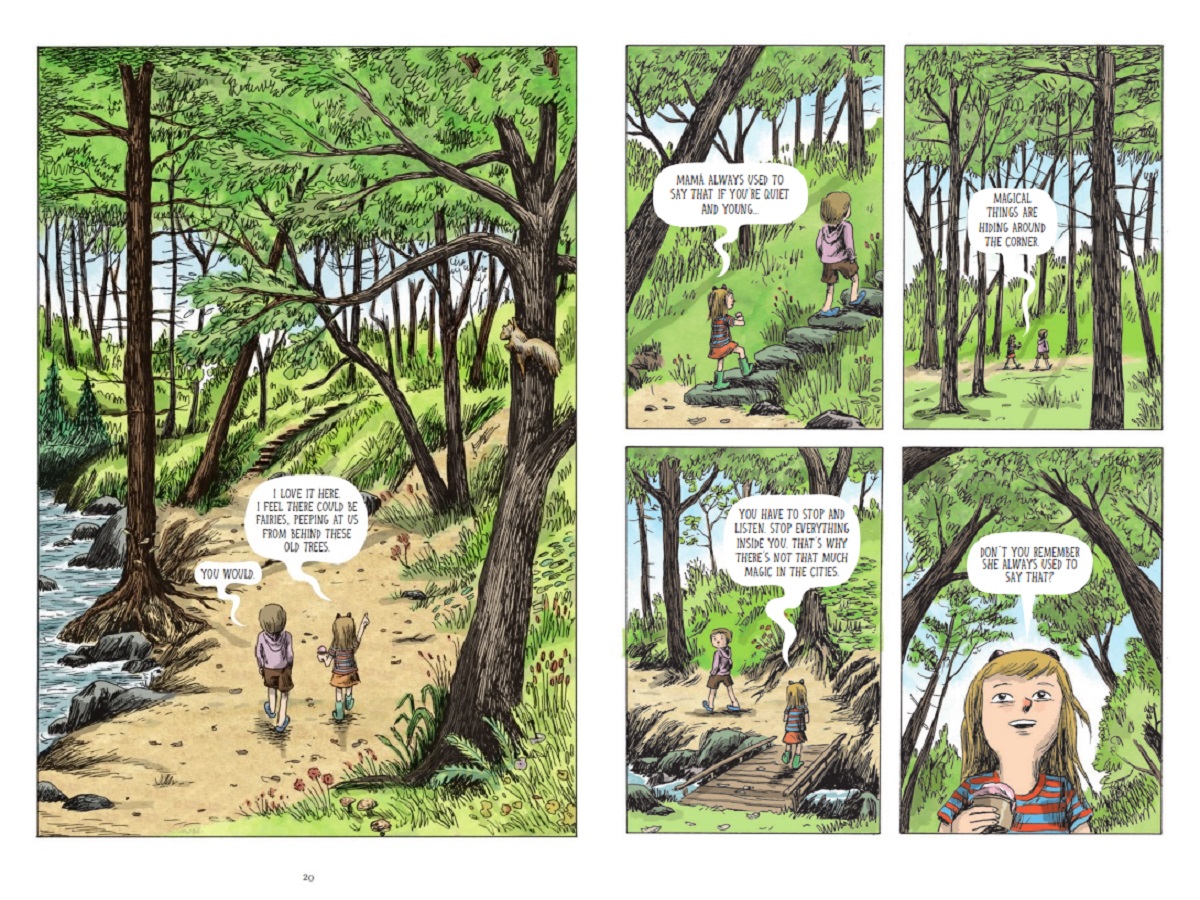 The ghost is friendly and young, has a beautiful and mysterious necklace, and has a romantic past. The fact that they can identify her with the help of microfilm and local gossip is a true homage to middle-grade detective series, and the different clues the sisters manage to pick up are informative and meaningful. The watercolors are astonishing (shout out to Christian Argiz) and I hope this is not the last of the collaborations between Angela and Liniers.