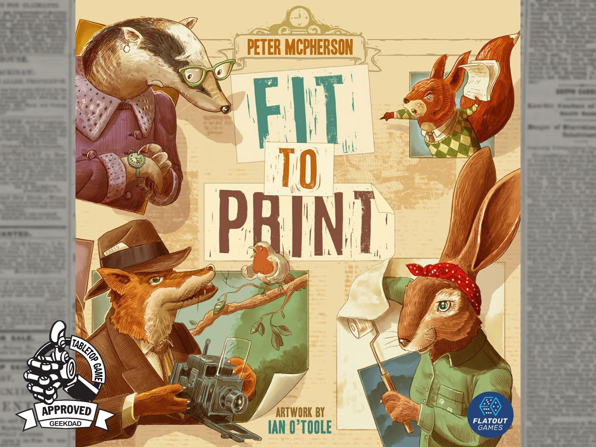 Although I review a lot of Kickstarter games, I am very sparing in awarding a GeekDad Approved seal to unfinished prototypes. I typically wait until I get the finished game and have gotten a chance to see the final product, in part because there are times where the production quality may be uncertain or there was still a good bit of rules tweaking or illustration work to be done. Fit to Print is a game that shines even in its prototype form, the majority of the artwork and rules are finalized, and Flatout Games has a good track record of producing high-quality components and getting their games delivered to backers. (Note that because it is still unpublished, we use the undated version of the seal, and Fit to Print could be eligible later for the seal in the year in which it’s actually published.)