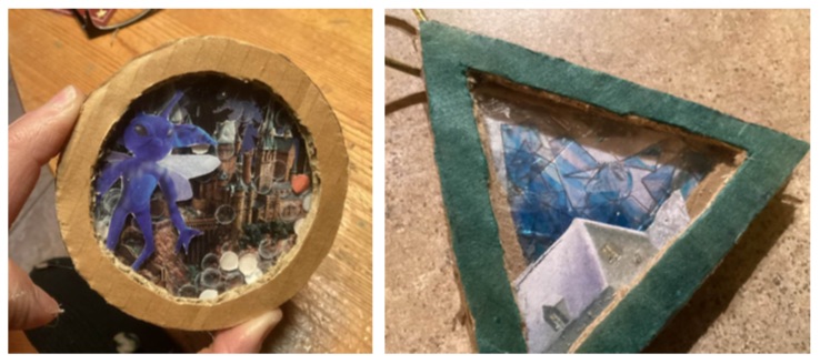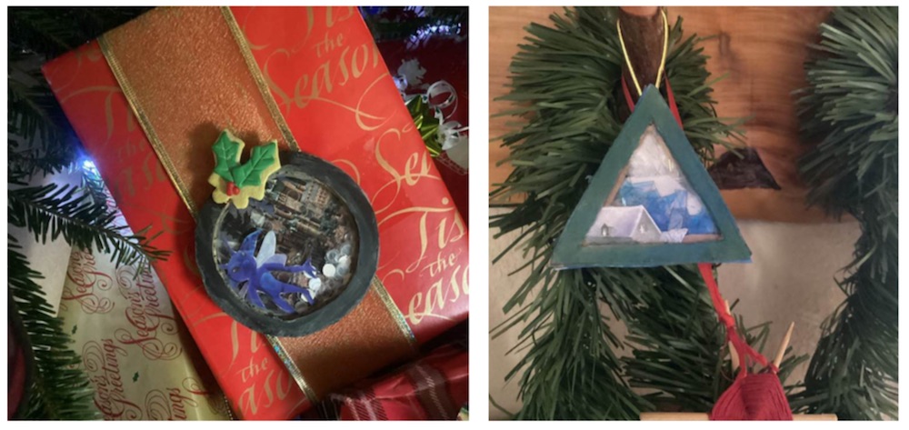 The snow globe construction is finished, you just need to paint or decorate the front edges however you want. Once finished, you can glue a ribbon to the back to make a tree or hanging ornament. These are lightweight, so you can easily attach a magnet or sticker to the back. Use these to decorate presents or to make your own greeting card designs.