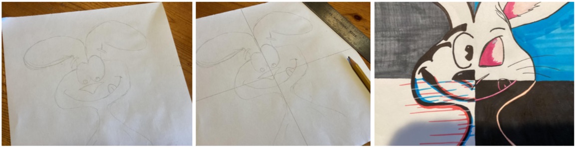 Draw a simple character’s portrait lightly in pencil, and using a ruler, split the image evenly with one vertical and one horizontal line. This gives you four equal sections, which in turn gives you four different little “canvases.”
