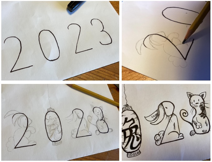 Now have them look at the numbers and ask them what they might see. A cat? A mouse? A car? A Pokemon? Draw that idea in pencil, using the number as a sort of “skeleton” for the doodle. Then go over it in ink. In some cases, the number will almost disappear into the drawing, and finding out what number is hidden in the final image can be a fun game to share with others.