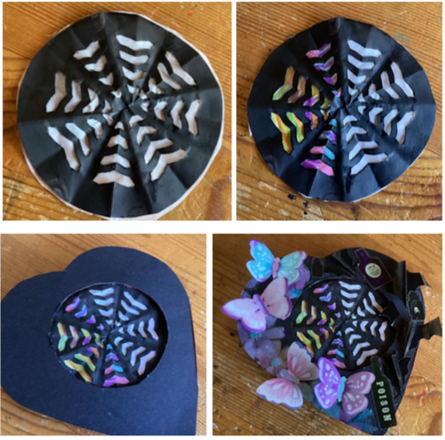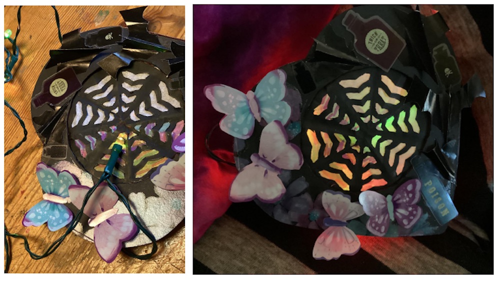 Paste the completed spider web window design, facing out, on the inside of the lid. You can add some more designs around the edge or leave it plain black. Now, your candy container isn’t just like everyone else’s.