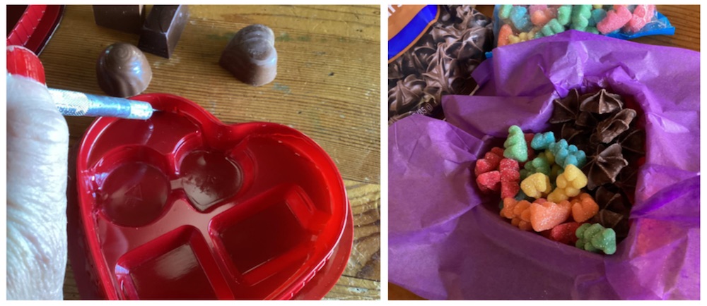 Want to make it even more fun? Remove the chocolate that came with the box. (Aw darn, I guess we’ll have to go ahead and eat that discarded chocolate.) Now, fill the right half of the box with some dark chocolate pieces or black licorice and the left half with bright-colored candies like Skittles or neon-colored gummy candies.