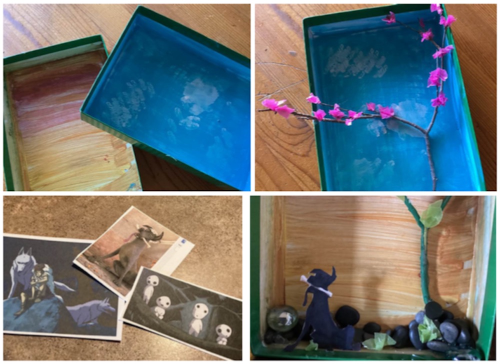 Cut out the image, and use paint or a black felt tip marker to turn it into a little silhouette. Glue it to the bottom of your shadowbox, and glue a couple of little blossoms or pebbles in front of it to give it some depth.