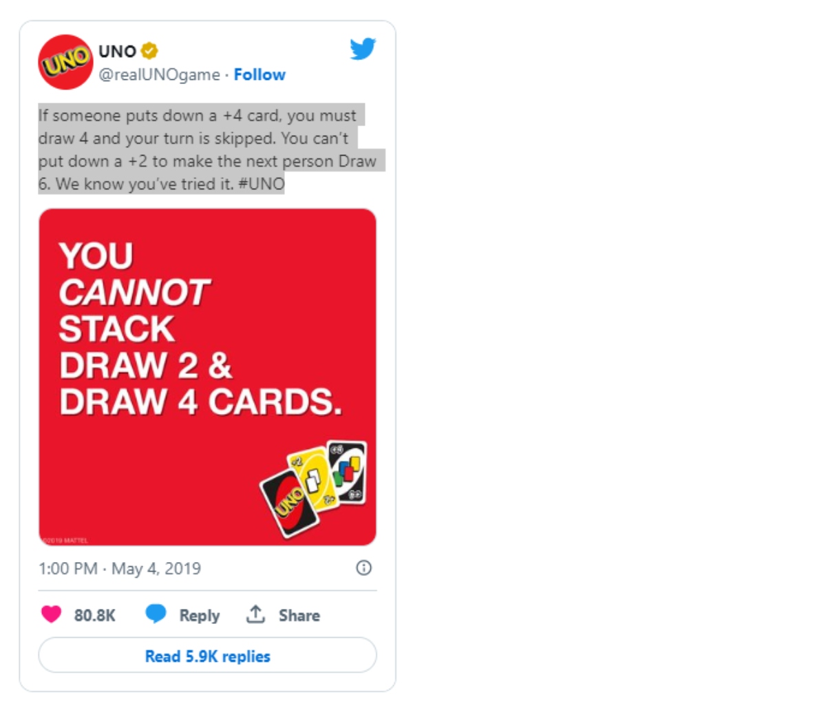 Uno made headlines in 2019 when the company flexed on social media by weighing in on the decades old family rule debate concerning the stacking of “Draw” cards. Anyone else still play with the stacking rules?