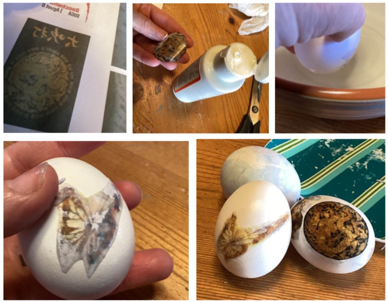Now, cut the image out as small as you need, and paint over it with ModPodge or other decoupage glue on the image side. A 1:1 mix of school glue and water works as well. Smooth the image onto the egg with as few wrinkles as possible. Once it dries completely, wet the back of the image. Finally, rub it off so only the image remains on the egg.
