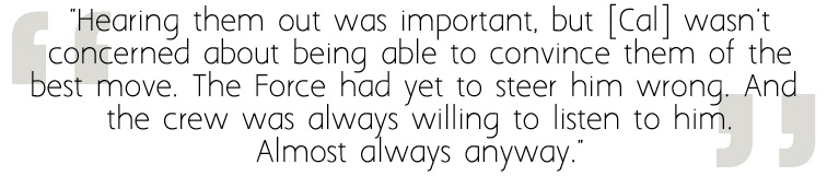What I can’t understand is the suggestion that the crew are somehow out of character here. OK, I’m not sure any of us expected Merrin to be quite so… *ahem* amorous, and I can certainly understand the disappointment felt by the Cal-Merrin shippers out there. Still, those readers suggesting the rest of the crew are OOC seem to want them to be precisely the same people they were at the end of the original game with no development in the intervening years which, to me at least, feels even more unbelievable.