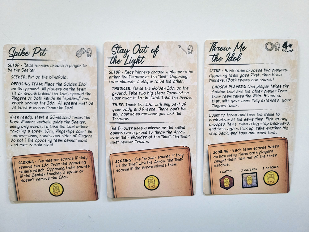 When you play a Card that overlaps any part of the Idol Chamber Tile, grab the Golden Idol and your team wins the Idol Race as long as the path was created correctly. (If not, the other team wins.) The winning Team earns a Gold Score Token (don’t look at the value yet) and selects the top Challenge Card for the Daring Challenge.
