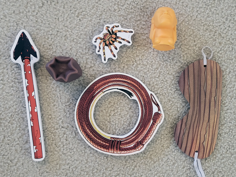The contents alone will start summoning nostalgia for fans of the films. Common traps like tarantulas and arrows are featured along with iconic props like the Golden Idol, the sandbag, and Indy’s whip. For this game, the props are made out of thick foam (the Whip, Arrow, and Tarantula) or light plastic (The Golden Idol and the Sandbag) as they’re used for different challenges. There’s a simple cardboard blindfold that will probably hold up okay over time. The cards are typical thickness, although the Challenge Cards are larger, and it should be noted that the Temple Cards are marked on the back to tell them apart. The Idol Temple Tile and Tokens are made of thicker cardboard, and I like how the Tokens have different shapes to tell them apart. The instruction booklet breaks things down easily and makes good use of pictures and diagrams to set up and teach the game. Overall, good components capture the feel of the film and should be able to handle lots of rougher play since this game is more physical.