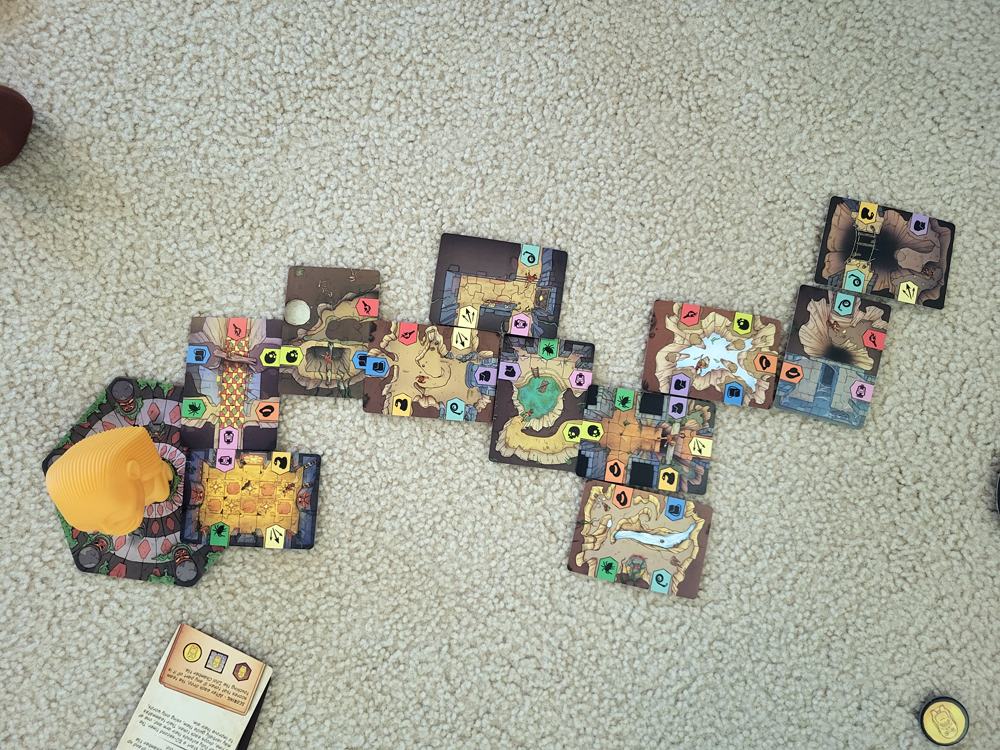Each team selects an Explorer, and when the Explorers are ready someone calls out “Nobody’s come out of there alive!” and play begins. Explorers flip their face-down Temple Cards over and attempt to create a path to the Idol Chamber Tile starting with the card already set out.