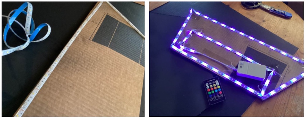 You will need a couple of cheap battery-operated LED strips (not the ones with the USB attachments) and large pieces of cardboard. I used the big tri-fold backdrops you can buy for school projects because you can get them in black, but any large boxes will work as well.