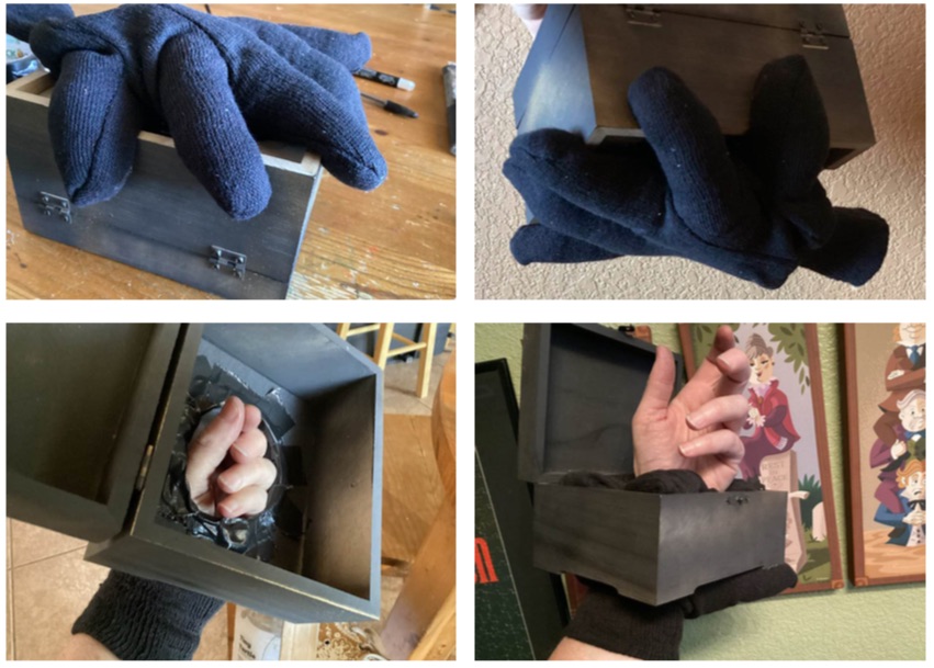 Place your hand gently into the glove and up through the hole in the glove and box. If all went well, your hand should stick up out of the box. This is why you don’t want to use a box with very high sides; you want to be able to see the hand.