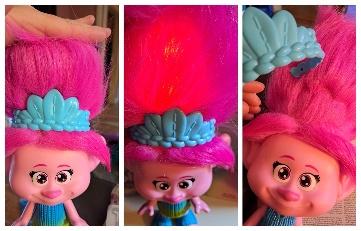This doll does have a higher cranium than the “real” Trolls, to accommodate the light box inside the hair. So you don’t get the kind of hair play you would expect, and while my kids just think it is hilarious it makes me think of Jane Curtis’s Prymaat from Coneheads every time I pick it up!