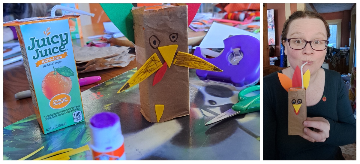 Our second craft, and my favorite, was the Juice Box Turkeys. Now I am a sucker for any turkey craft, be it handprint, feathered, or a turkey made out of a pumpkin, and this I just adored. We have a plethora of foam paper in our house at the moment—we use it for the thankful leaves—so we substituted foam in place of the construction paper. We also could not find our stash of googly eyes, so got inventive. This is definitely going to be something that makes it into our annual rotation. Now I just need to find a spiked cider juice box for me to drink during the parade!