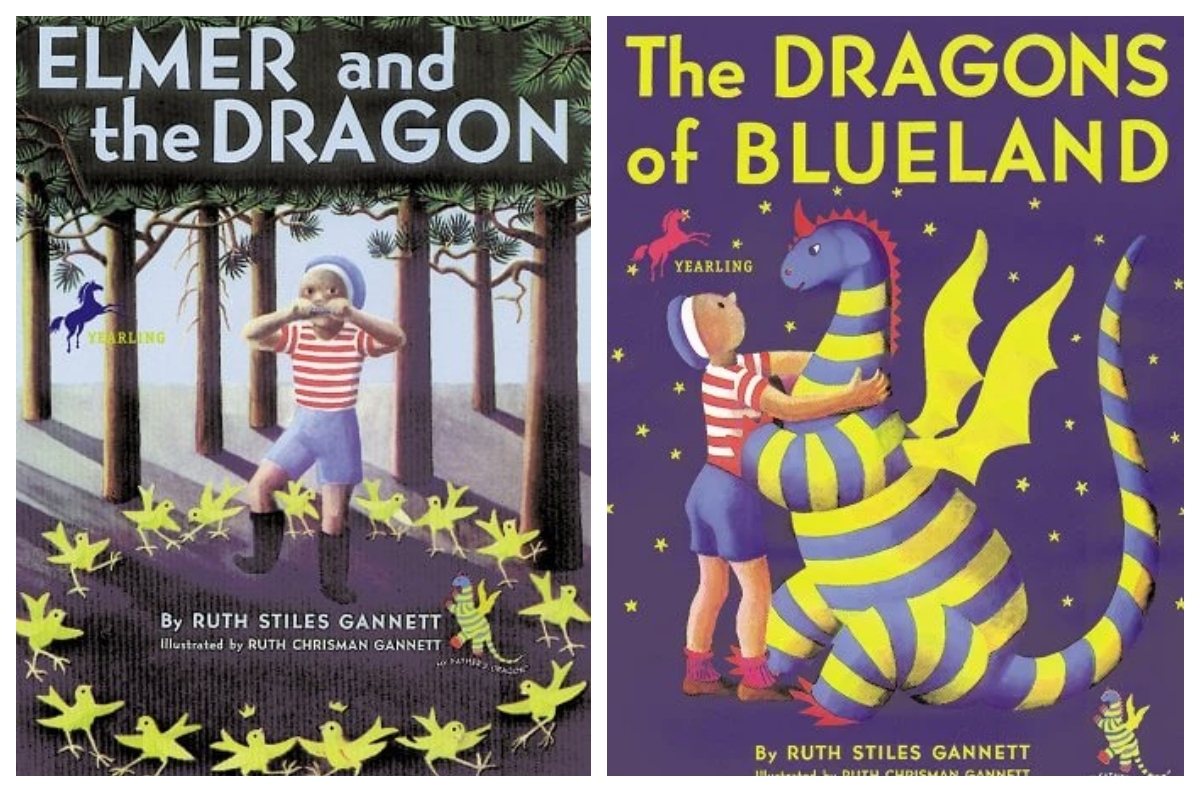 My Father’s Dragon is a tale within a tale within a tale. The unnamed child of the named father narrates the story of how, long ago, their father was told a story about a dragon and set off on an adventure to rescue him. The baby dragon had the misfortune of falling onto Wild Island, where the island’s lazy animal inhabitants captured him and forced him into serving them, making him fly them across a dangerous river each time they wished to cross. He is kept on a chain, with a bell to summon his services. The baby dragon’s sad tale reaches young Elmer Elevator by way of a cat who has given up adventuring. Elmer sets out on a rescue mission that is both charming and thrilling.