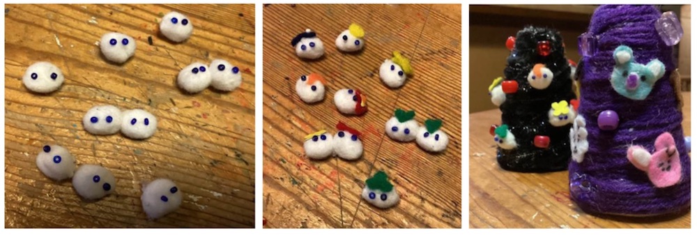 Now, add some mascot ornaments with pom poms or just plain felt. You do not have to be a great artist and completely replicate these little ‘toons. I suggest using just a pair of small beads or little jewels or eyes, or you can paint them on. You don’t need to try and add every detail of a face or even worry about a body for these. The simpler you stay, the more fun you will have. Plus, if the group is small enough (five or fewer members), you can make ornaments or two of each character.