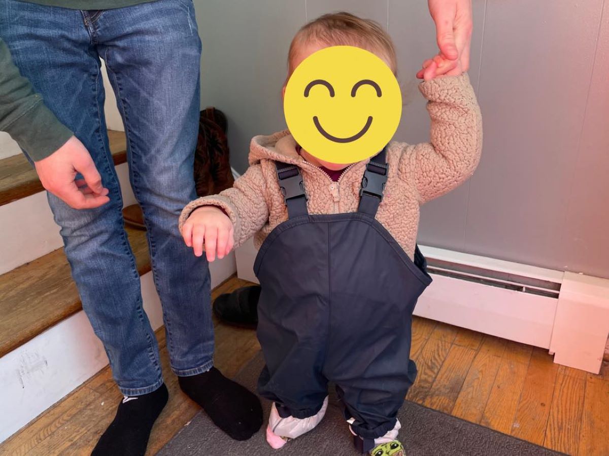 One of our favorite items so far is my daughter’s rain pants, which you can see her modeling below. They are a lightweight raincoat-like material that can pull on over clothes, coats, and even snowsuits. They keep my daughter clean and dry as she plays in water, mud, snow, wet sand, you name it! Also, they make her look like a little lobsterman, so that’s a big plus.