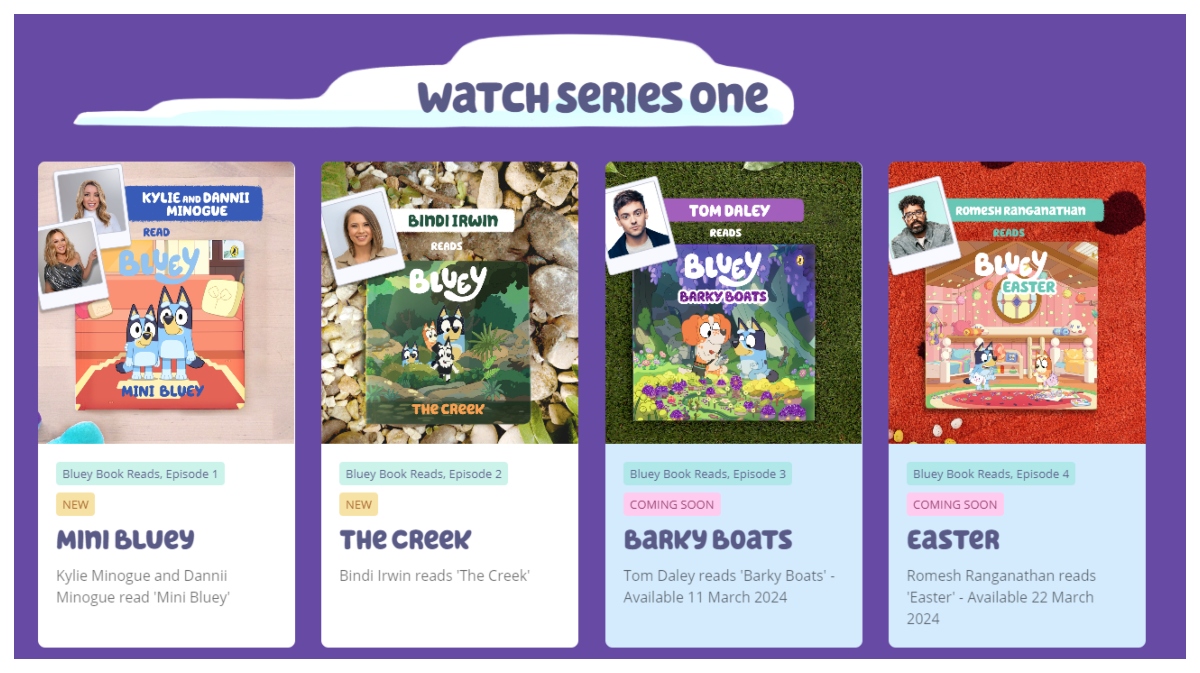 In Bluey Book Reads, available on the Bluey website and on the YouTube channel, we have a new way to experience our favorite Bluey stories. Using a combination of visuals from the books, and off-screen narration from an amazing array of global stars, the stories come to life from the page in a brand new way.