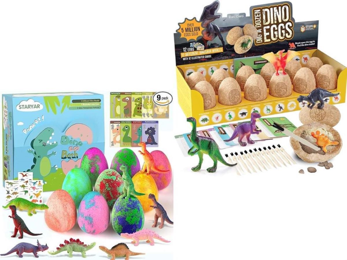 A similar alternative to excavating toys from an egg could be some dinosaur egg bath bombs. Children and adults alike are often mesmerized when watching the gentle fizzing of a bath bomb disintegrating. This fizzing poses an opportunity for scientific questions and a conversation with your child about chemical reactions! Afterward, your child can enjoy some imaginative play in brightly colored bath water with their new dinosaur figurines. This set is made of organic shea butter and essential oils–natural and gentle ingredients for your child’s skin–and comes with a fun fact card for each of the nine dinosaurs.