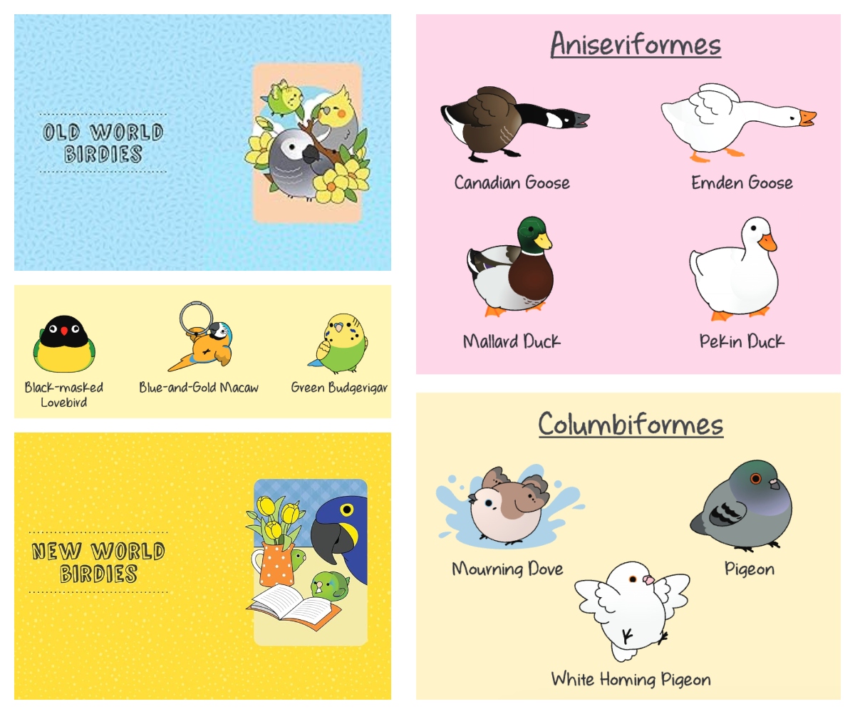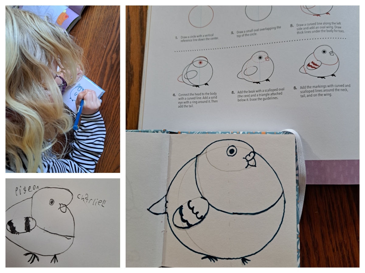 The book details four different body types for the birds—oval, round, tall, and long—but all of the kawaii birds are delightfully chubby. There are old-world birds, new-world birds, domesticated birds, and my favorite, wild birds. There is no bird discrimination in the choice of birds in this book. It really goes into nice but easy-to-understand detail about all the different types of birds and what makes them different. We are avid bird watchers from our living room couch, and it’s nice to draw what we see.