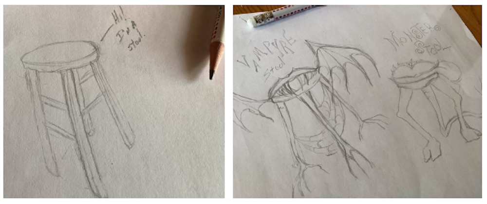 Now, just begin doodling. Draw the item you want pretty simply and straightforwardly. If it is a table, draw a table. Now, add the magic. Give it a reason to come to life and be a little different. A little goofy. A little… weird.