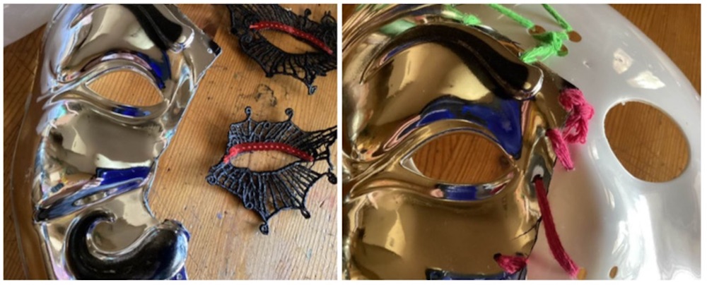 I am going to find pieces of several old masks we have stashed somewhere—paper, plastic, cloth—and piece them together to make something a little eclectic, a little colorful and fun… and a little unhinged.