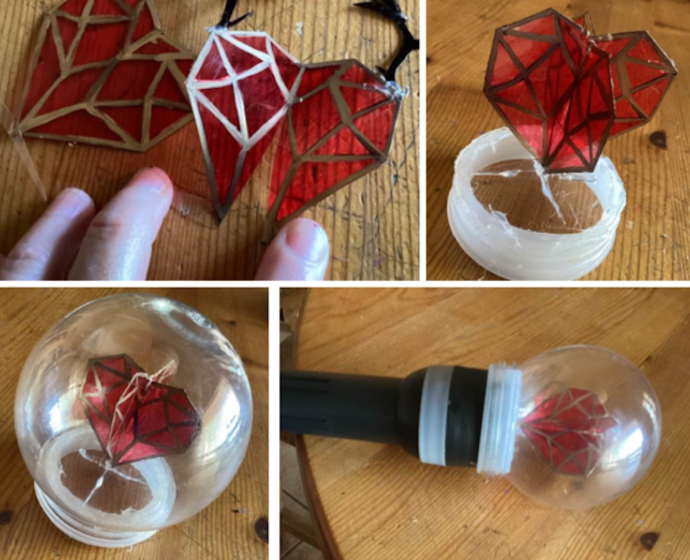 Once the glue dries, place the shape in the center of the now-clear stopper base. Secure good with glue and let dry. Place the stopper, with your new design, up into the globe’s orb, and there’s the big end of the light stick.
