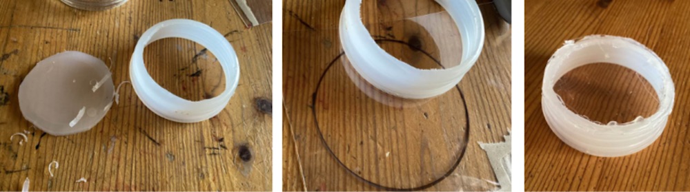 Using the clear plastic, trace the width of the snow globe base on the plastic. Glue it over the hole of the stopper base. It is a nice, clear surface for light to pass through easily.