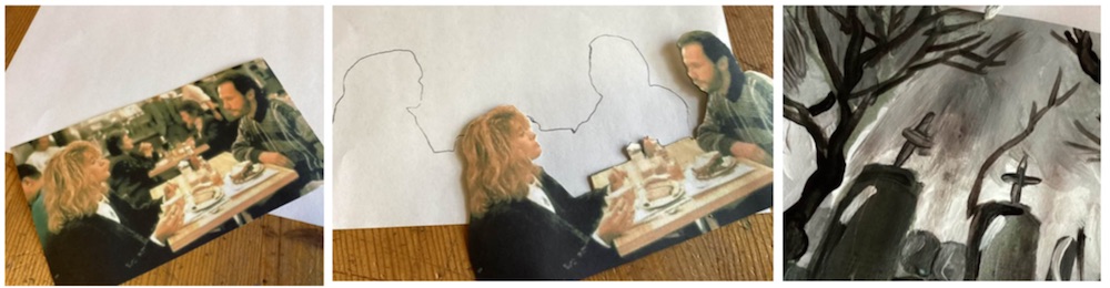 Find a film or television show image that you want to change to a more spectacular location. One of those “talky” dramas or rom-coms usually set in someone’s home, café, a courtroom drama… hospital drama… or even a western set mostly in the desert. Find a still shot of one or two of the characters and print and cut out the characters. Place them where they might go on in their new environment.