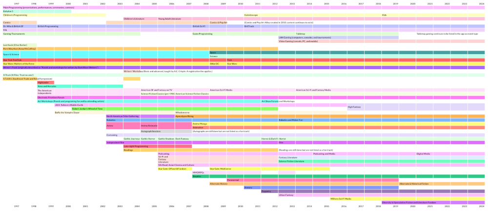 So what do 70,000 people do for a long Labor Day weekend in Atlanta? More than 3,500 hours of programming. Alas, you cannot see it all, no matter how hard you try. But it’s still worth trying! Here’s how your options of fandom tracks have changed over time, updated through 2024. Click the image to open it in a new tab and see it in its entirety–it was large when I started it, and it just got longer!