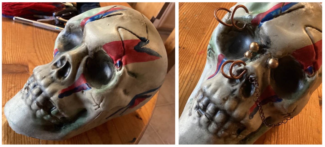 Now, give it a few piercings. Place some hoops and studs around the eye and nose cavities. Add a chain from the nose to just above the jaw (where an earlobe would be if it had one). Some plastic skulls are soft enough to poke holes in, but you can also glue gun them in place.