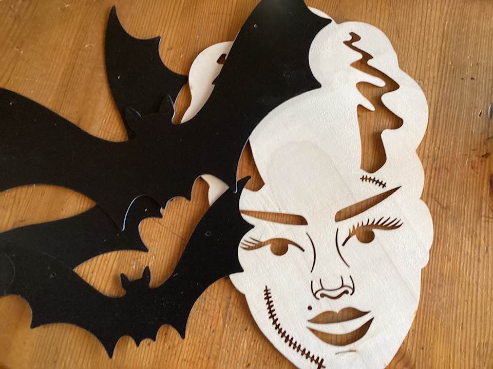 I used a simple wood cutout from a dollar store and black bat cutouts my daughter found in a discount bin someplace this summer.
