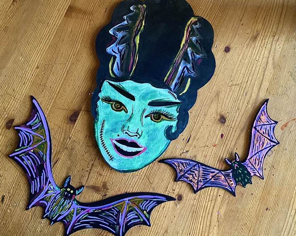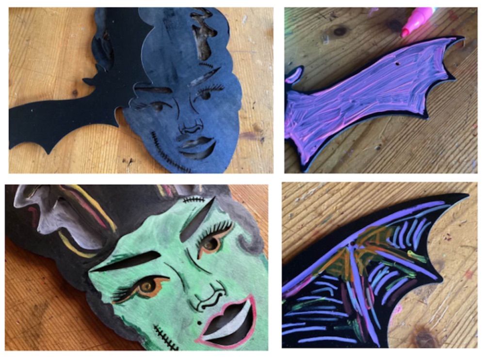 Now, paint some bright details: eyes, wings, fangs, flames, spider webs, or whatever you can think of. It doesn’t have to be fancy or too complicated. We are going for carnival-style, not renaissance impressionism. Keep adding colors and strokes to make a colorful florescent scene ready to try out against a black light.