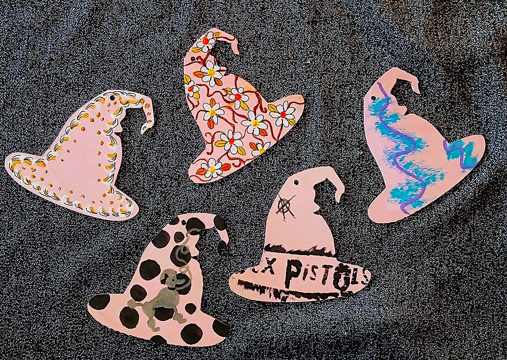 I raided a dollar store and found a pack of simple witch hats. I am going to show you five different eras, so make sure you have enough. They are all identical for now…until we add some color, especially pink.