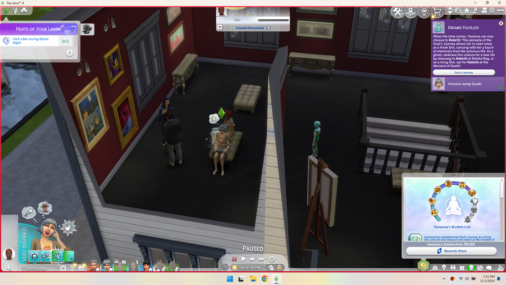Bucket List items are kind of fun. You can randomly write one, pick from a category, or even erase the list if you want new choices. Some were things like reconnecting with a family or reaching level 10 in a skill and admiring your skills in some way. Traveling to a place requires you to stay a full 24 hours there to count. Other options can come up on their own too. Some line up with Aspirations as well, which really helps you earn progress faster. Completing Bucket List items, Aspirations, and even Resolutions and Wants will add to your Soul Journey meter giving you bonuses along the way. You need more work to complete it if you start it at Elder, but completing an Aspiration or two and a few Bucket List items when the feature becomes available at Young Adult is very doable.